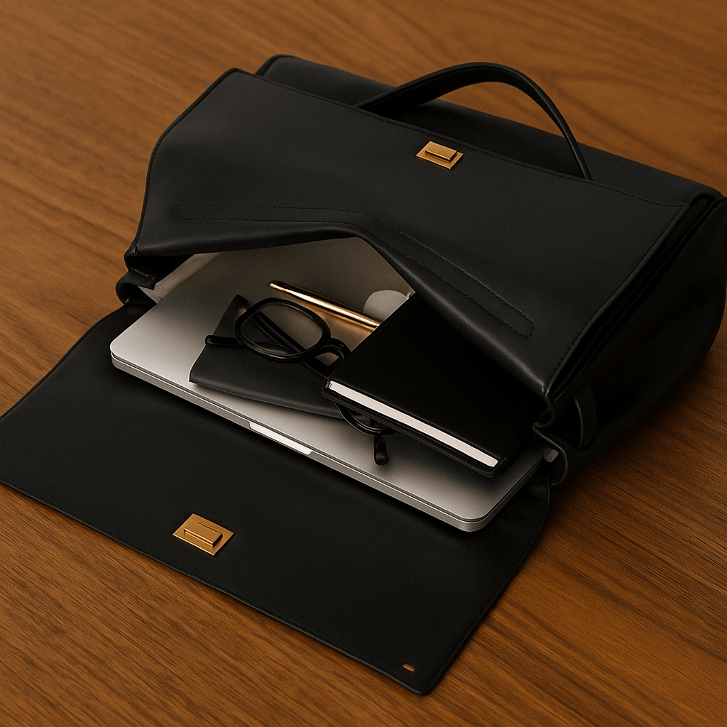 Entwickelt, um lange Tage zu erleichtern: eine Aktentasche, die von der Hand auf den Rücken wechselt, ohne die Linie zu verlieren. Nappa für die Patina, wasserabweisendes Segeltuch für die Straße, doppelter Überschlag für die Ruhe. Alles hat seinen Platz, nichts schreit.