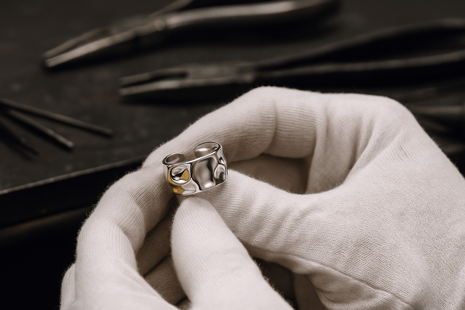 Fragment de matière comme façonné par le vent, Lucia évoque un paysage intérieur, brut et précieux. Une bague unisexe au relief martelé, en acier poli, rehaussée d’un éclat doré qui accroche la lumière sans la dompter. Chaque courbe dit quelque chose de vous sans jamais crier.