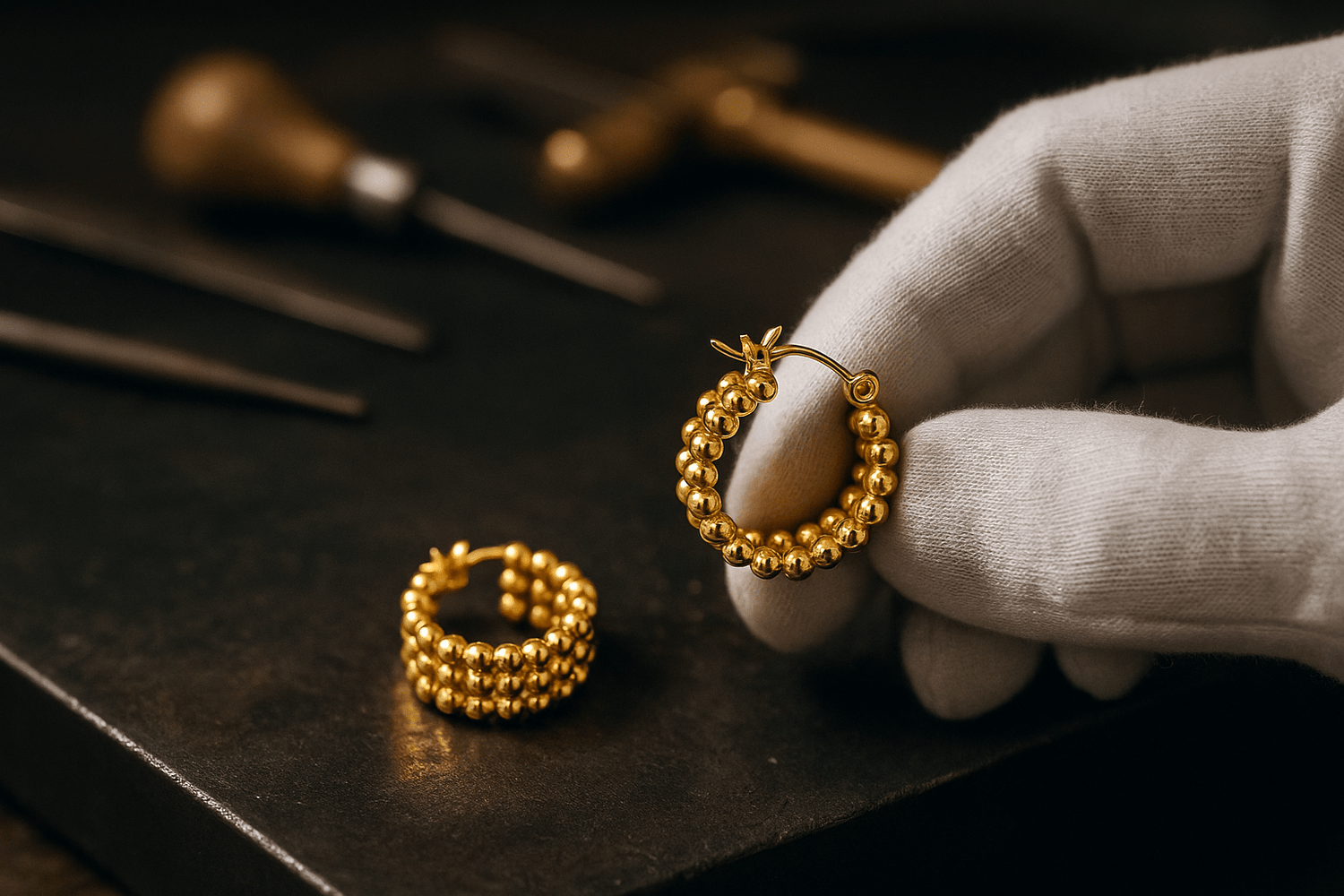 Sculpturales et solaires, les boucles Dolcezza incarnent un glamour assumé. Trois rangées de perles dorées forment une créole dense, presque architecturale. Un hommage au chic vintage, réinventé pour les femmes d'aujourd'hui. Elles habillent le visage comme un soleil discret : présentes, audacieuses, justes.