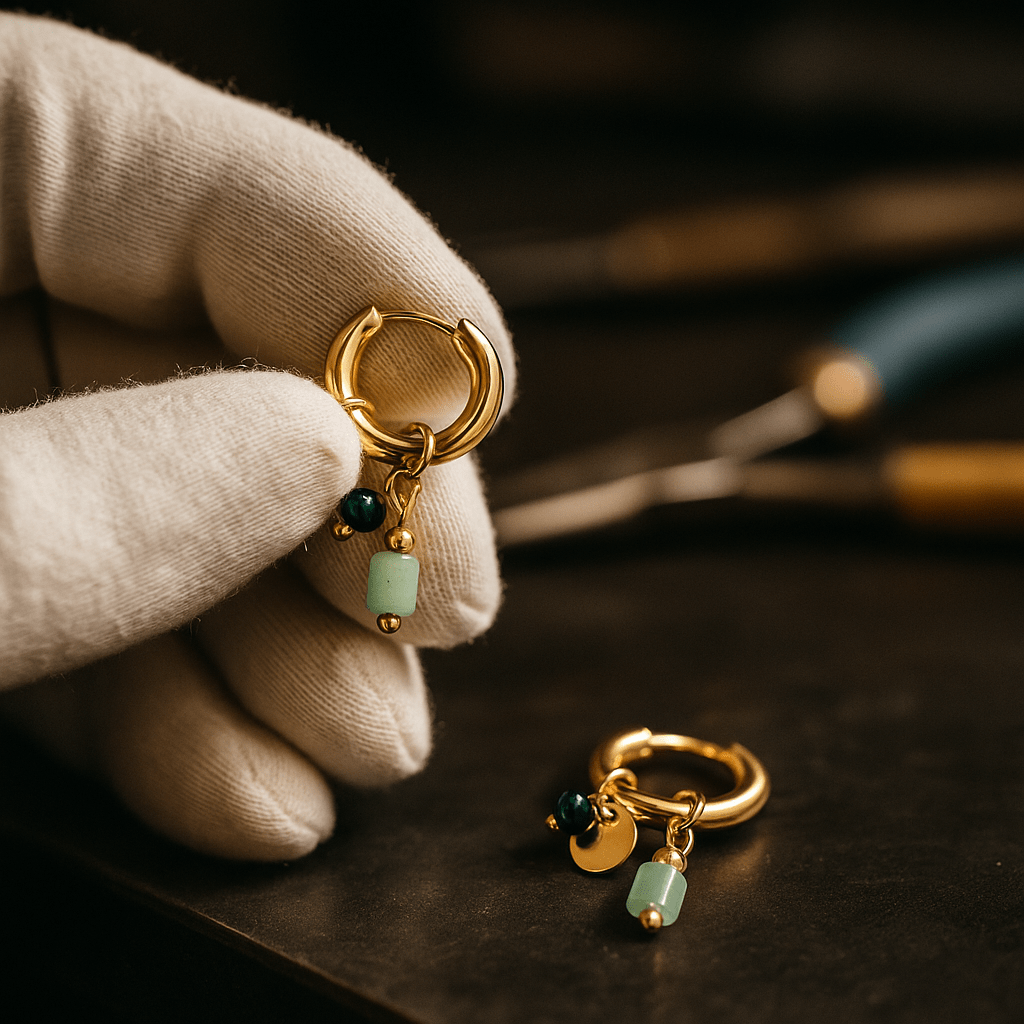 Maria ne brille pas. Elle pulse. Chaque pierre choisie, Malachite protectrice, Aventurine inspirante, raconte un fragment de soi, d’une vie solaire tournée vers l’intérieur. À leur éclat minéral s’ajoute l’or chaud des créoles, comme un écrin pour accueillir l’essentiel.