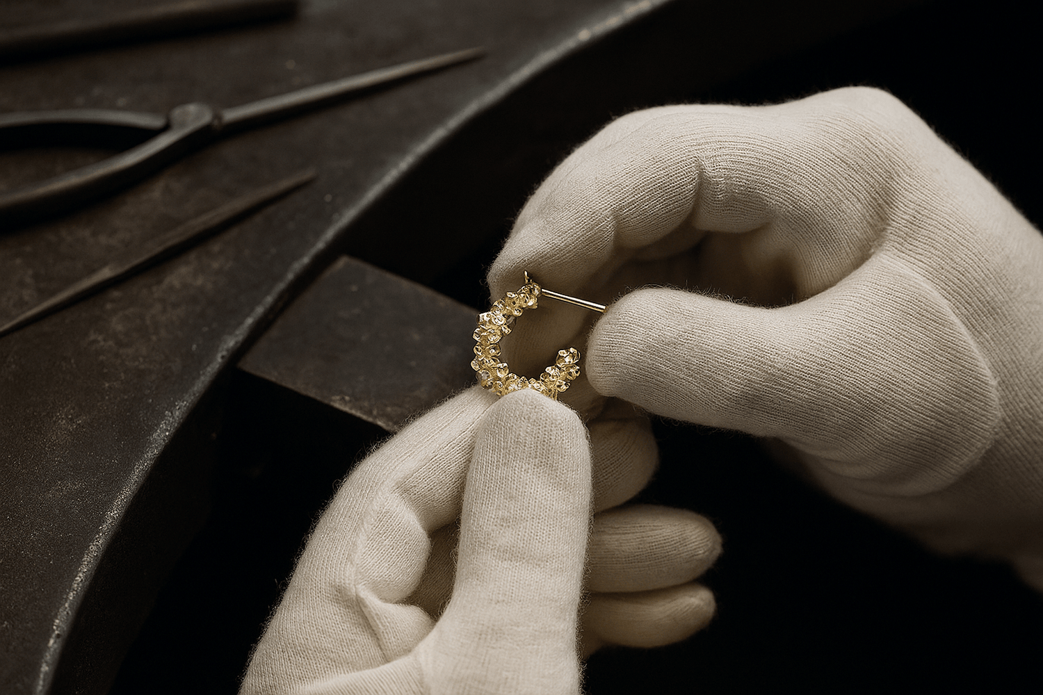 Les boucles Palladio rendent hommage à une forme parfaite, aux symétries anciennes et à l’intelligence des mains silencieuses. Leur rondeur évoque le cycle des transmissions, les liens qu’on noue et qu’on garde, même sans les voir. Nées de la collection Eternale, elles murmurent ce qui reste quand tout passe.