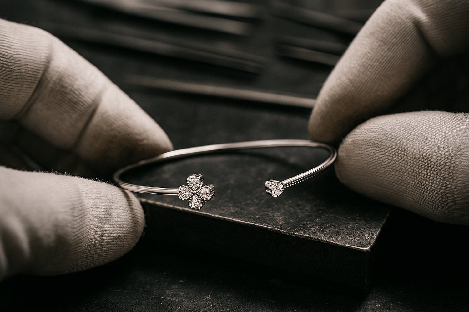 Entre cœur et trèfle, deux symboles se rencontrent autour du poignet : l’amour sincère et la chance discrète. Ce jonc ouvert en argent pur enlace l’intime et l’éclat dans un bijou qui dit sans parler. À offrir, ou à porter comme un secret précieux.