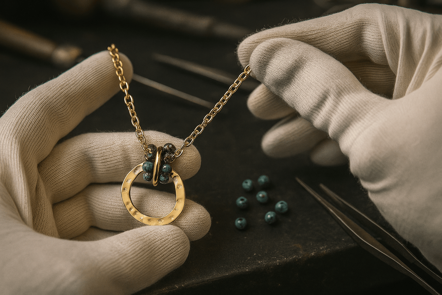 Allevare signifie “élever”. Ce collier en porte l’intention : celle d’un geste offert, d’un ancrage dans la matière et d’une légèreté portée au quotidien. Inspiré des talismans anciens et des pierres parlantes, il rappelle les bijoux que l’on crée pour protéger, pour transmettre.