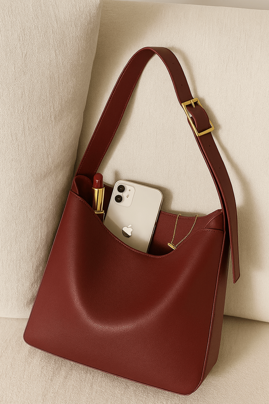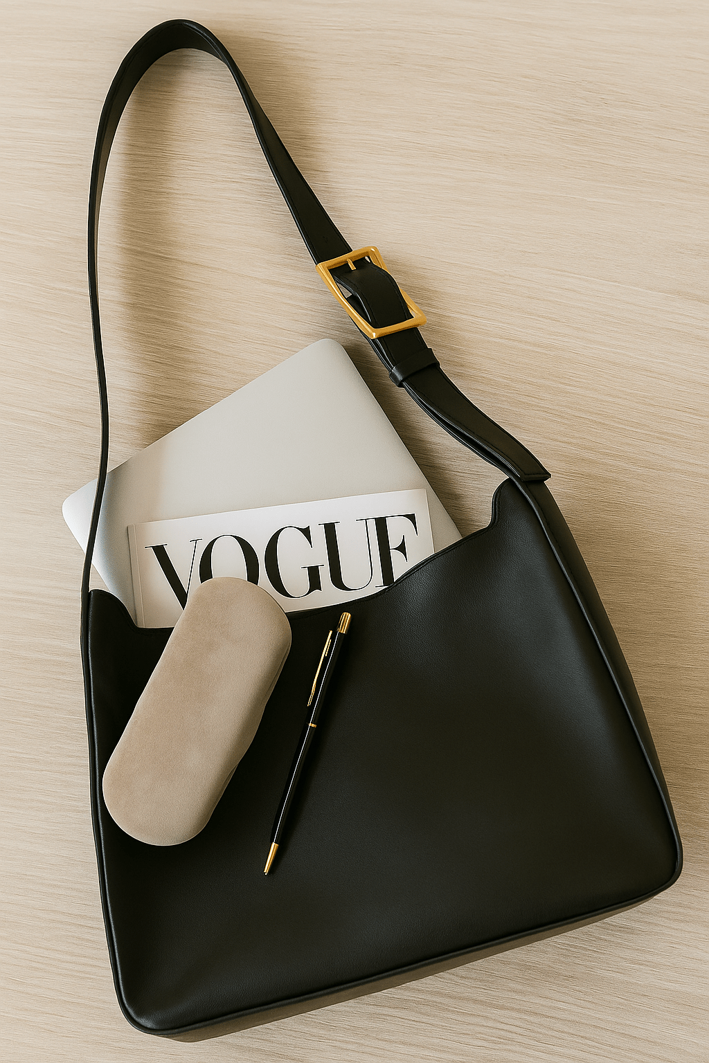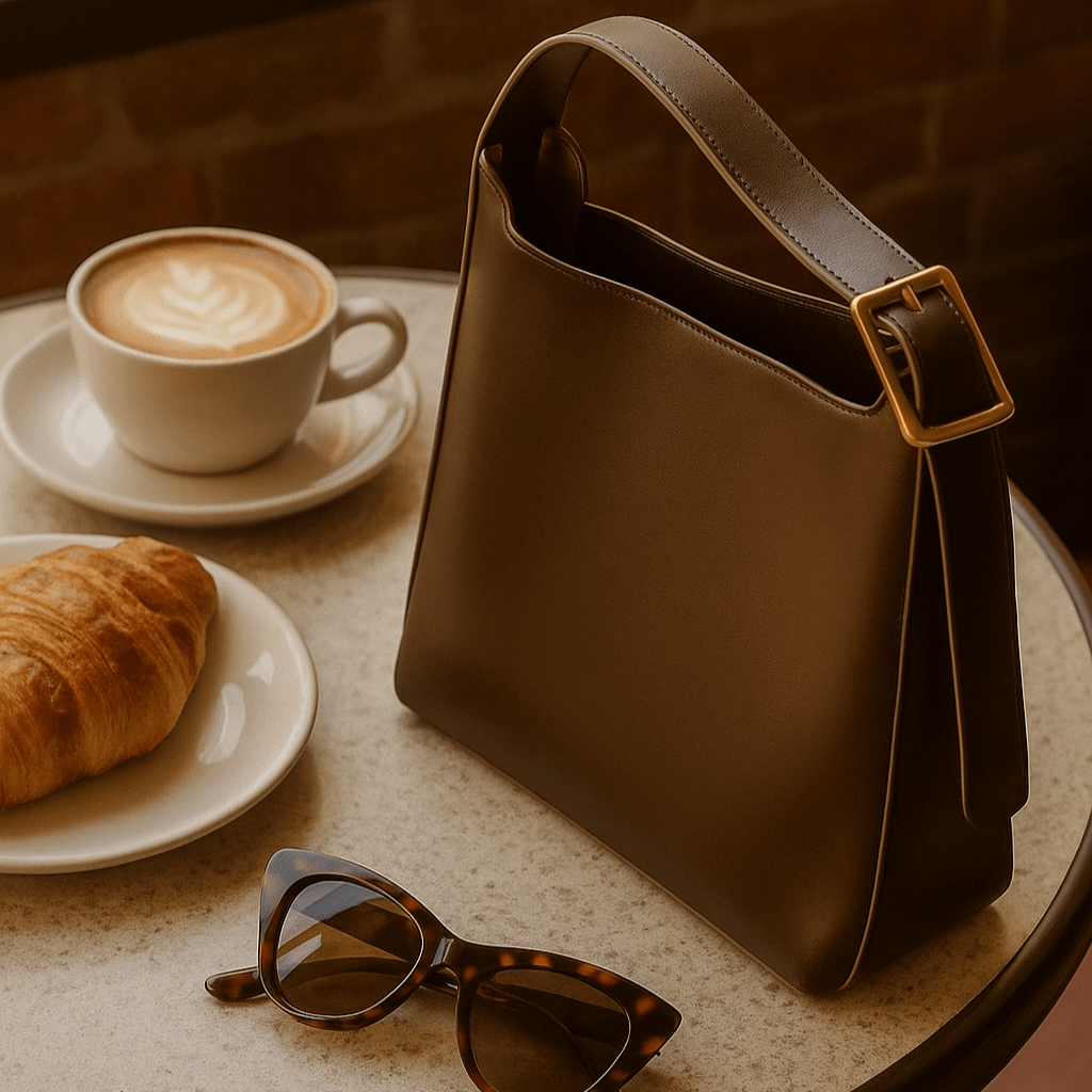 Alba suit le pas de la ville. Hobo minimal en cuir vegan lisse, anse réglable à boucle dorée, grand format maîtrisé pour le quotidien. Sous l’épaule, il garde carnet, lunettes, tablette; une allure calme, précise, qui ne lâche pas la main.