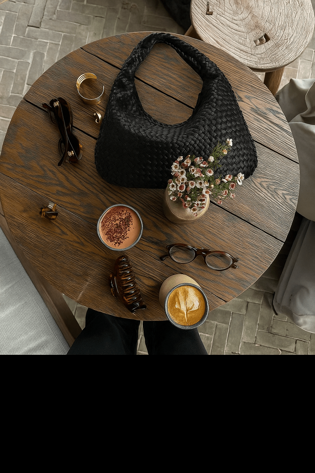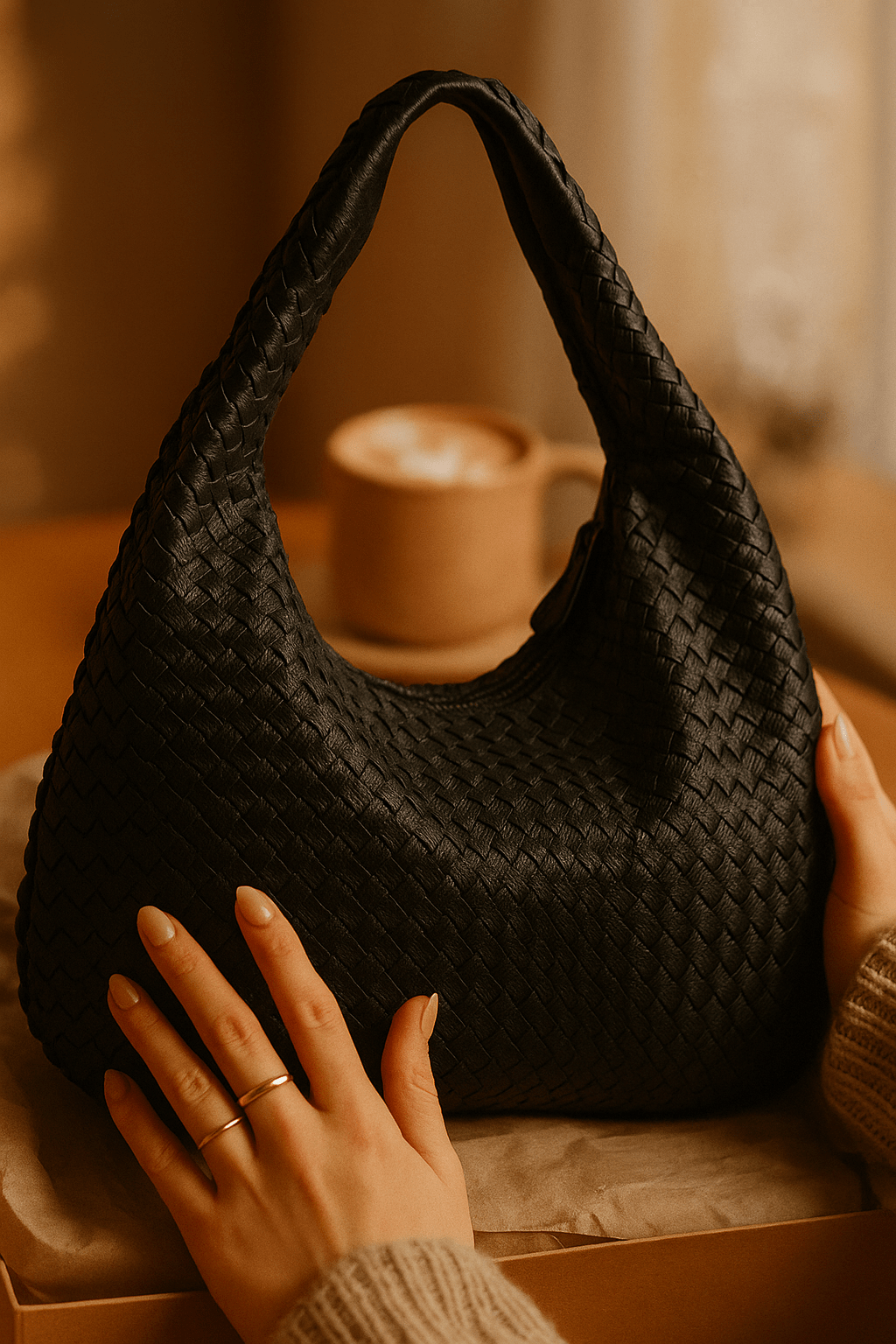 Né d’un besoin simple : un hobo chaleureux qui tient à l’épaule et libère les mains. Nous avons tressé un cuir vegan souple, presque textile, pour capter la lumière sans quincaillerie. Demi-lune ample, présence discrète, compagnon fidèle du quotidien.