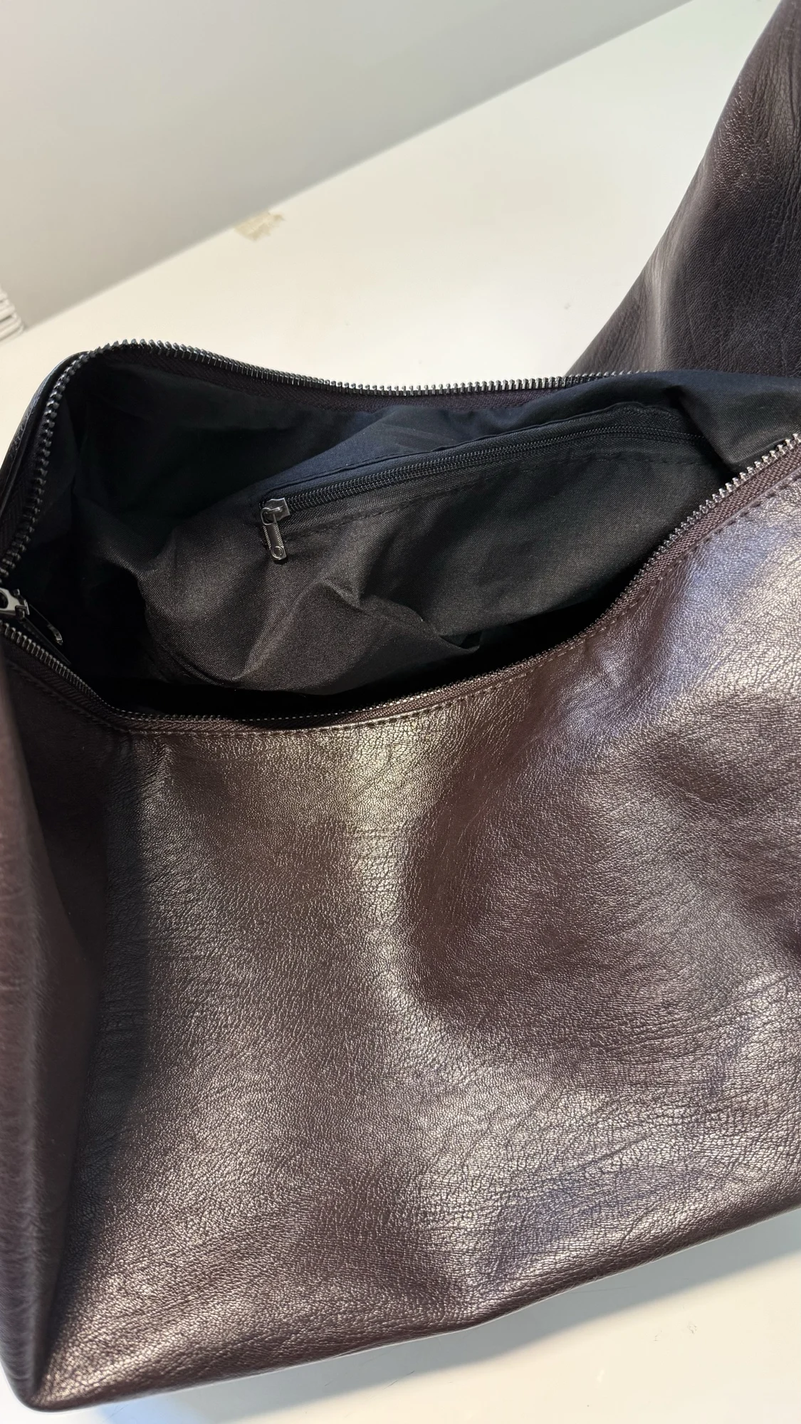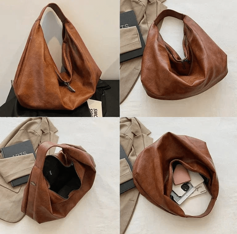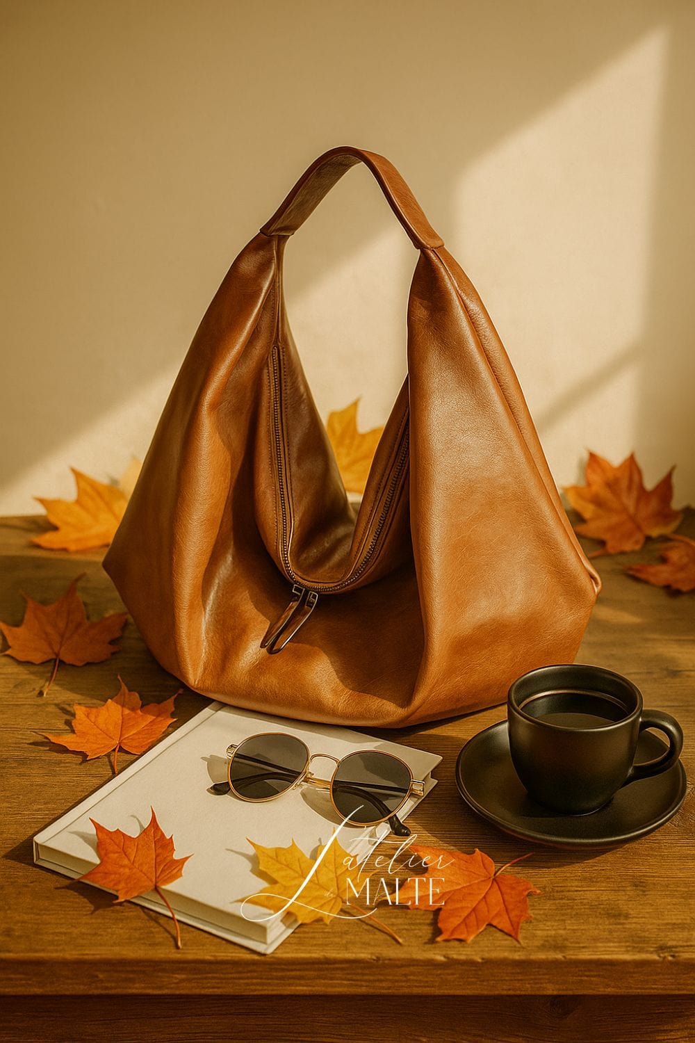 Terra suit le rythme sans peser. Hobo ample, chute souple, zip protecteur et anse unique qui se glisse à l’épaule ou en crossbody. Format généreux pour carnet, trousse, veste légère — une élégance calme, prête pour la journée.
